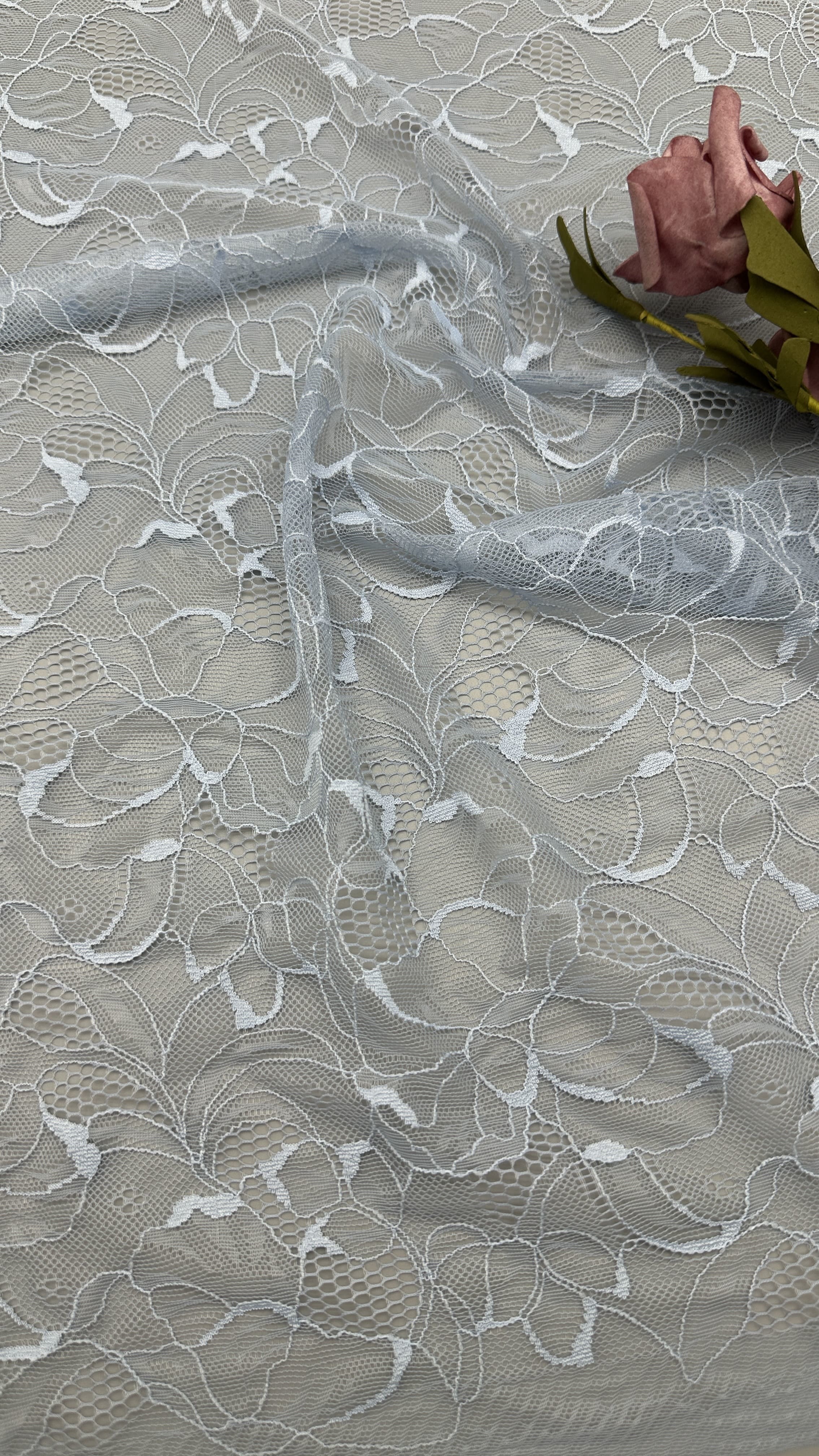 Kanten borduurstof met delicate bladmotieven is een populaire keuze voor trouw- en feestjurken en biedt elegantie, textuur en ingewikkelde details. De technologie achter de productie omvat een mix van traditioneel vakmanschap en moderne textielinnovaties.